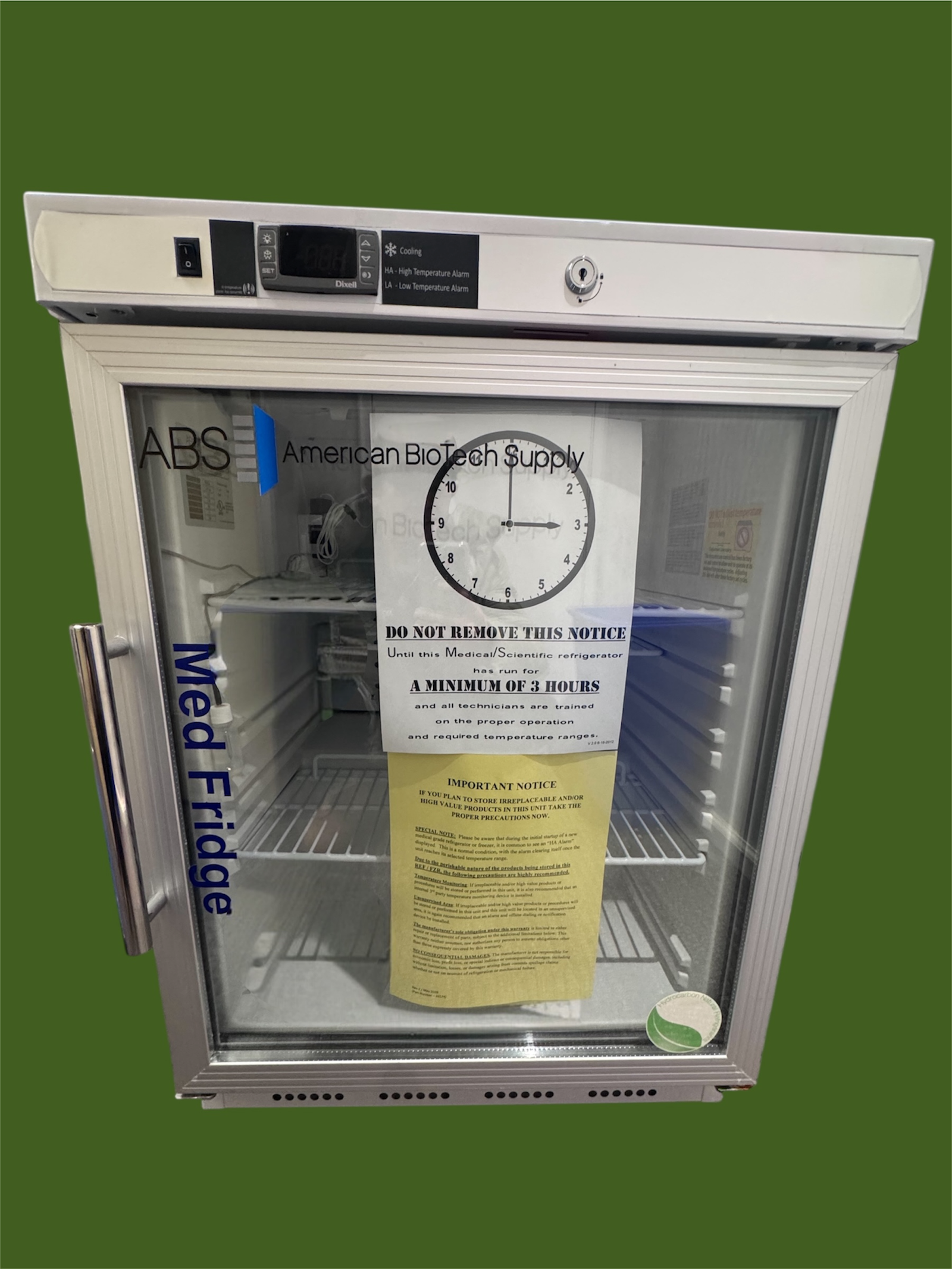 Brand New medical-grade undercounter refrigerator designed for secure storage of medications and temperature-sensitive clinical supplies. Built with an ADA-compliant height and a clear glass door for easy visibility and quick inventory checks.