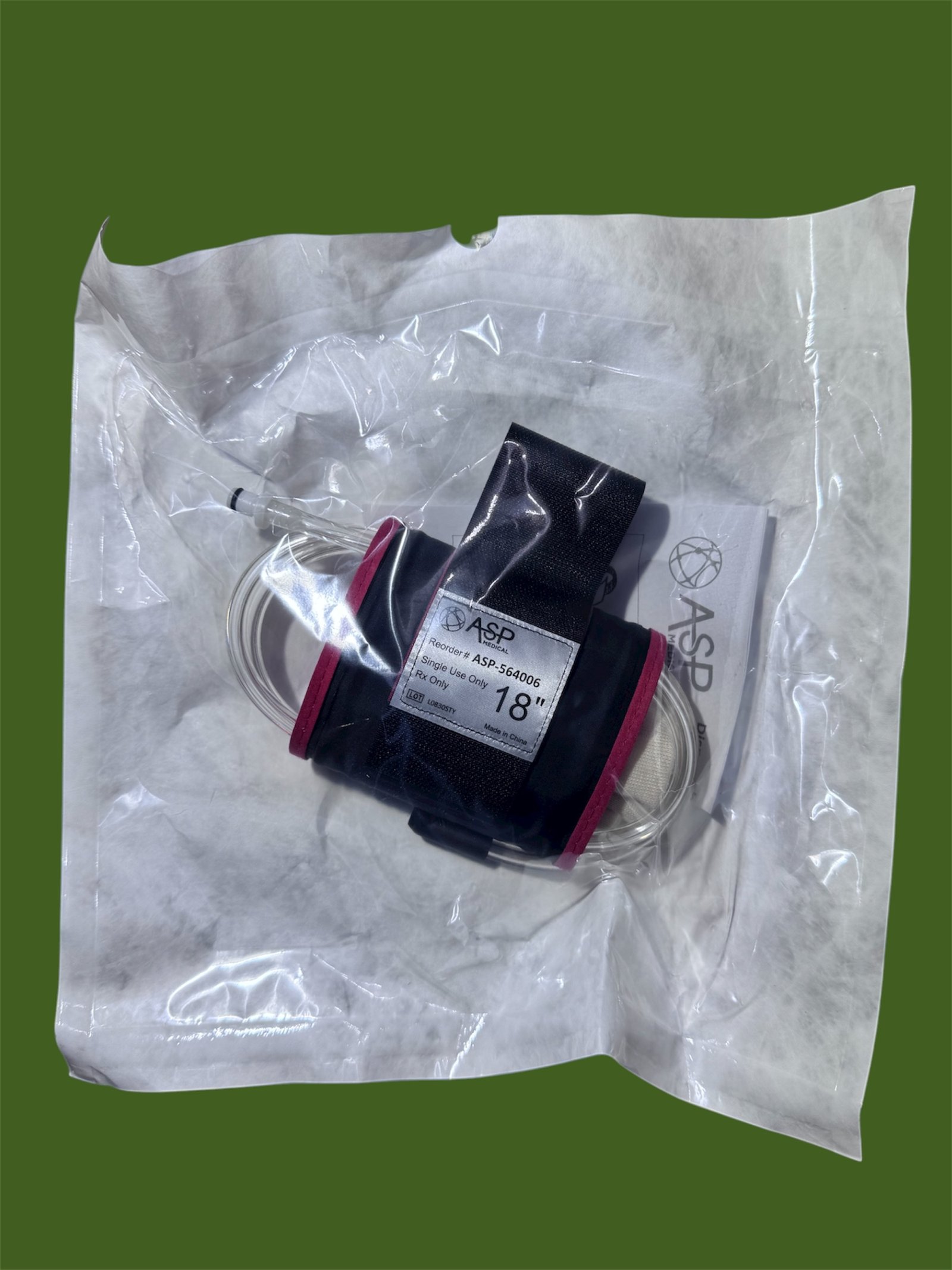 This ASP Medical disposable tourniquet cuff is a brand-new, sterile, single-use unit designed for reliable performance in operating rooms and clinical settings. The cuff comes sealed in its original packaging and includes the integrated tubing required for quick setup and consistent pressure control.